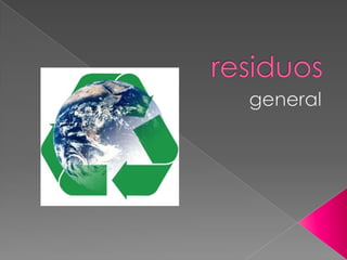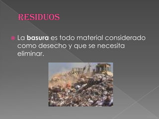 Los residuos son todo material considerado como desecho que necesita ser eliminado. Se clasifican en orgánicos e inorgánicos, y pueden ser sólidos, líquidos o gases. Los residuos orgánicos son biodegradables, mientras que los inorgánicos se degradan más lentamente y a menudo requieren métodos de reciclaje mecánicos o artificiales para su descomposición. La basura espacial es el resultado de la destrucción de satélites y cohetes en órbita.