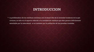 El documento describe la problemática de los residuos urbanos en México. Las principales causas son el rápido crecimiento demográfico, la concentración de la población en ciudades, el uso de bienes de rápido deterioro y envases no degradables. La gestión incorrecta de residuos genera suciedad, malos olores, incendios y contaminación de aguas. Las soluciones incluyen el vertido controlado, la incineración, el reciclaje y el compostaje. El problema de residuos en México aumenta exponencialmente debido al consum