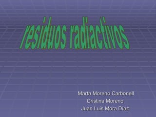 El documento describe diferentes tipos y clasificaciones de residuos radiactivos, así como varias opciones que se han considerado para su almacenamiento o eliminación, como el entierro en el lecho marino, los hielos antárticos o el envío al espacio, que se han abandonado por ser inviables o peligrosas. También analiza opciones como la transmutación, el reprocesamiento o el almacenamiento en depósitos subterráneos, que presentan ventajas e inconvenientes.