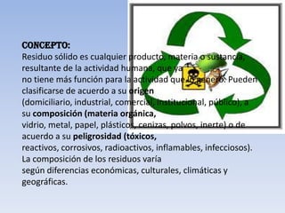 El documento clasifica los residuos sólidos según su estado, origen y tipo de manejo. Los residuos se pueden clasificar como sólidos, líquidos o gaseosos. También se clasifican por su origen en residuos municipales, industriales, mineros u hospitalarios. Otra clasificación es según su manejo, como residuos peligrosos, inertes o no peligrosos. El sistema de manejo de residuos incluye su generación, transporte, tratamiento, disposición y control.
