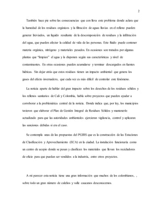 Este documento resume una noticia sobre el impacto de los desechos recolectados en Cali que terminan en el relleno sanitario de Yotoco. Explica que estos rellenos son una fuente potencial de contaminación ambiental y para la salud. También describe las consecuencias de los lixiviados producidos en el relleno y los gases de efecto invernadero. Finalmente, menciona algunos proyectos como las Estaciones de Clasificación y Aprovechamiento para mejorar la gestión de residuos sólidos.
