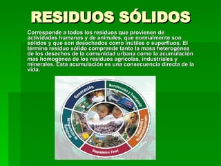 El documento habla sobre el tratamiento de residuos sólidos. Explica que los residuos sólidos provienen de actividades humanas y animales y son desechados. Luego clasifica los residuos por su estado físico, origen y tipo de manejo. Finalmente describe procesos como el compostaje, la biometanización, los vertederos y el tratamiento de residuos orgánicos industriales para producir compost, biogás o etanol.