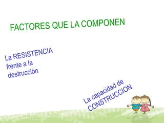 Este documento trata sobre la resiliencia. Define la resiliencia como la capacidad de una persona o sistema social de desarrollarse positivamente a pesar de condiciones de vida difíciles de manera socialmente aceptable. Explica que la resiliencia depende de factores protectores como el apoyo familiar, las habilidades sociales y la autoestima. También describe rasgos comunes en personas resilientes como la introspección, independencia, creatividad e ideología personal. Finalmente, recomienda acciones que pueden promover la resiliencia en niños de diferentes edades como