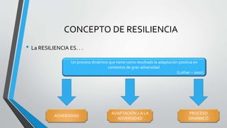 Este documento trata sobre la resiliencia. Define la resiliencia como un proceso dinámico que resulta en una adaptación positiva ante la adversidad. Explica que la resiliencia depende del contexto y puede cambiar a lo largo de la vida. También discute factores que construyen la resiliencia como las relaciones positivas y la participación significativa. El documento propone formas de fortalecer la resiliencia de los docentes mediante el trabajo en equipo y el reconocimiento de sus contribuciones.