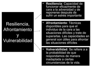 La resiliencia se refiere a la capacidad de funcionar eficazmente ante la adversidad y recuperarse del estrés, mientras que la vulnerabilidad se refiere a la probabilidad de responder de manera inadaptada a ciertas circunstancias. El afrontamiento son las técnicas disponibles para enfrentar situaciones difíciles y tratar de superarlas, como las capacidades útiles para afrontar situaciones estresantes.