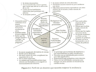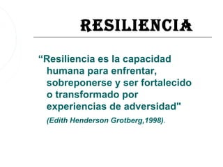 La resiliencia se refiere a la capacidad humana de enfrentar y superar la adversidad. Se originó a partir de estudios que encontraron que algunos niños en situaciones de riesgo lograban desarrollarse de forma positiva. La resiliencia implica factores como la percepción de adversidad, la adaptación positiva y los mecanismos emocionales, cognitivos y socioculturales que influyen en el desarrollo. No depende solo de la pobreza extrema y se ve favorecida por factores individuales, de apoyo social y educacional