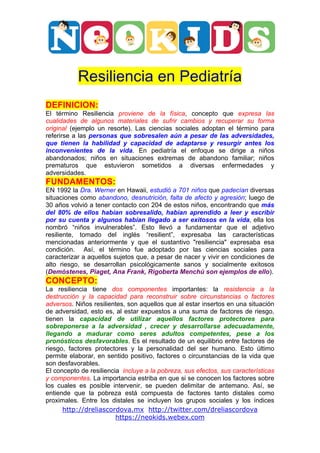 El documento define la resiliencia como la capacidad de sobrellevar situaciones adversas y recuperarse de ellas. Explica que los niños resilientes pueden crecer sanos a pesar de vivir en condiciones de riesgo debido a factores protectores como el afecto y el apoyo. Identifica varios momentos clave en el desarrollo de un niño, como el embarazo, el nacimiento y la infancia, que influyen en su capacidad de resiliencia.