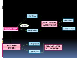 Este documento describe diferentes formas de mejorar la resistencia aeróbica y anaeróbica, incluyendo entrenamientos continuos y fraccionados, así como principios básicos como la progresión y continuidad. Explica los efectos del ejercicio sobre el organismo a diferentes ritmos cardíacos y detalla métodos como la carrera continua, fartlek e interval-training con distancias cortas y tiempos de recuperación. Además, menciona otras actividades como juegos populares y danza.