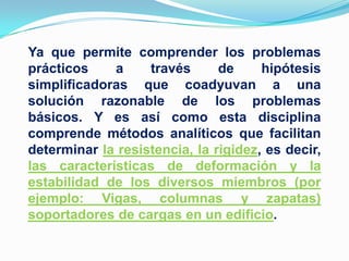 Este documento trata sobre la mecánica de materiales y su historia. Explica que la mecánica de materiales estudia cómo se deforman los sólidos bajo cargas y ha sido útil en la ingeniería desde la antigüedad. Destaca las contribuciones de Galileo, Hooke, Bernoulli, Navier y Coulomb para comprender el comportamiento de vigas y otros elementos estructurales. También describe cómo la mecánica de materiales se aplica en diversas ramas de la ingeniería para diseñar estructuras y maquinaria de manera segura.