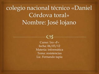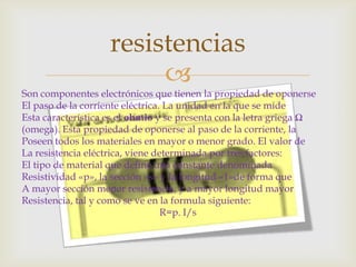 Este documento describe las resistencias eléctricas. Explica que las resistencias se miden en ohmios y que su valor depende del material, la sección y la longitud. También describe los diferentes tipos de resistencias, incluyendo fijas, variables y especiales, y explica cómo se lee el código de colores para determinar el valor de una resistencia.