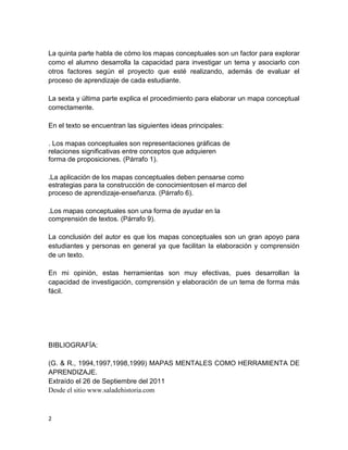 Los mapas conceptuales son representaciones gráficas que muestran las relaciones entre conceptos en forma de proposiciones jerárquicas, lo que ayuda a comprender mejor un tema. El documento explica que los mapas conceptuales son una herramienta efectiva para estudiar y comprender textos, así como para desarrollar la capacidad de investigación. Finalmente, concluye que los mapas conceptuales facilitan la elaboración y comprensión de la información.