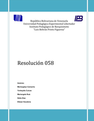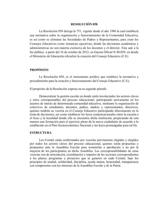 La Resolución 058 deroga la Resolución 751 de 1986 para crear los Consejos Educativos. Los Consejos Educativos reemplazan a las Sociedades de Padres y Representantes e involucran a más actores en las decisiones académicas y administrativas de las escuelas. La Resolución 058 establece la estructura y funciones de los 11 Comités que componen los Consejos Educativos, incluyendo los Comités de Padres y Representantes, Académico, Seguridad, Comunicación, Ambiente, Dep