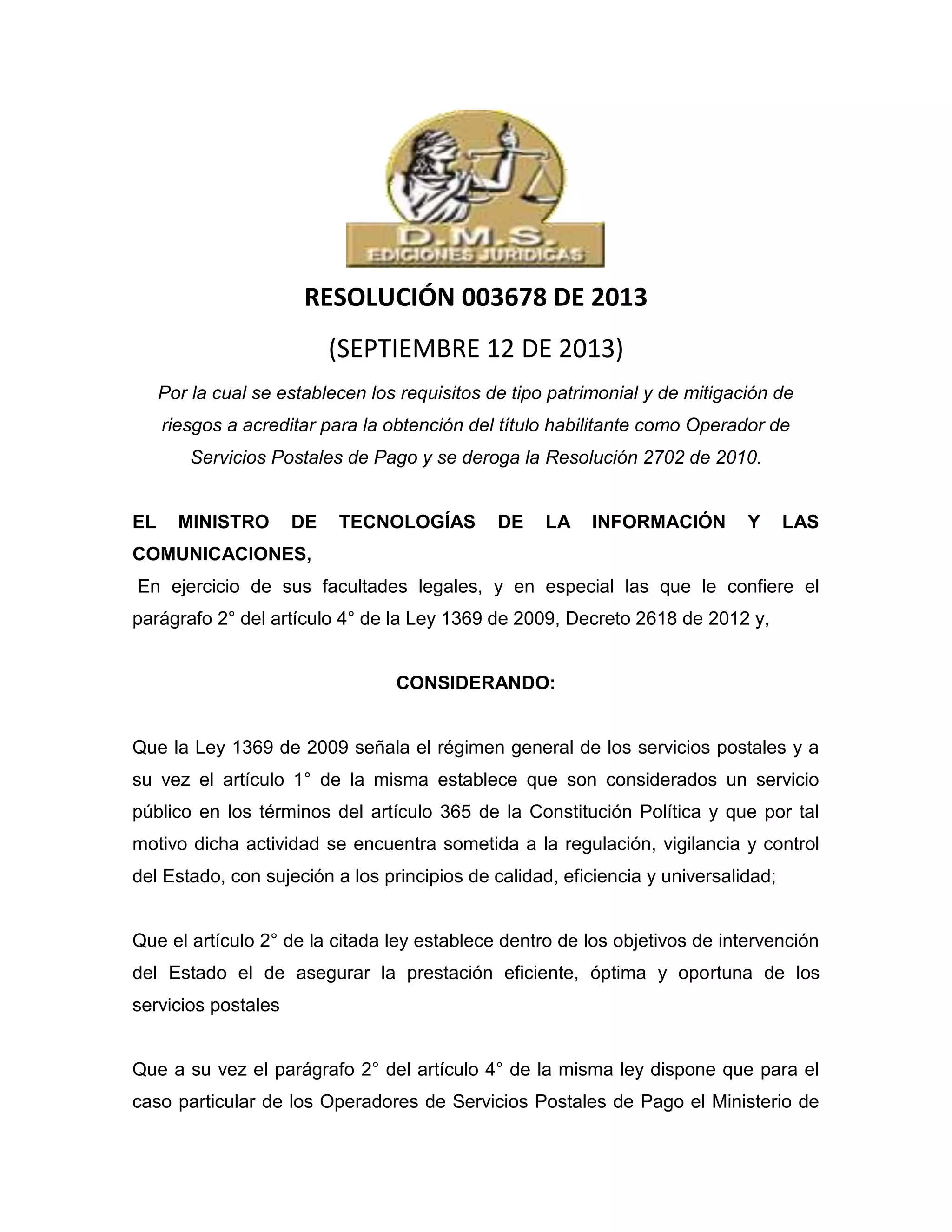 Esta resolución establece nuevos requisitos patrimoniales y de mitigación de riesgos para los Operadores de Servicios Postales de Pago en Colombia. Los requisitos incluyen montos mínimos de capital para garantizar la prestación eficiente del servicio y sistemas para administrar riesgos como lavado de activos. La resolución también clarifica el proceso de habilitación y registro que deben seguir los operadores para iniciar legalmente sus operaciones.