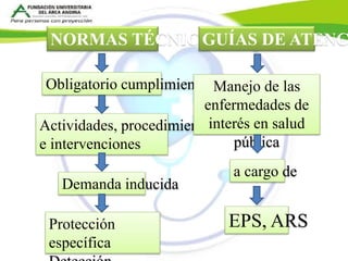 La resolución 412 de 2000 establece las normas técnicas y guías de atención obligatorias para las Entidades Promotoras de Salud, Entidades Adaptadas y Administradoras del Régimen Subsidiado. Incluye actividades de protección específica como vacunación, atención en salud bucal, parto y recién nacido, y planificación familiar, así como detección temprana de enfermedades. También presenta guías para el manejo de enfermedades de interés en salud pública. Las EPS deben ofrecer estas intervencion