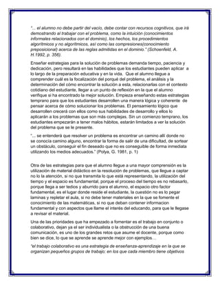La resolución de problemas es un proceso complejo que involucra analizar la situación, formular hipótesis, considerar posibilidades, y probar procedimientos para encontrar una solución. Es importante desarrollar estas habilidades a través de la educación para poder resolver problemas cotidianos de manera razonable. Un enfoque efectivo incluye enseñar estrategias de resolución de problemas temprano, utilizar material didáctico interesante, y fomentar el trabajo colaborativo para que los estudiantes puedan desarrollar pensamiento lógico