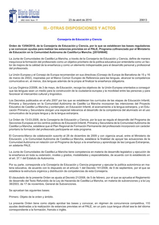 Este documento establece las bases y convoca 110 ayudas para realizar estancias de 4 semanas en el extranjero como parte del Programa de Apoyo a la Enseñanza y Aprendizaje de Lenguas Extranjeras (PALE) en Castilla-La Mancha. Los beneficiarios son profesores de centros públicos que hayan completado las fases 1 y 2 del PALE pero no la estancia en el extranjero. Las ayudas cubrirán los gastos de viaje, alojamiento y manutención con una cuantía máxima de