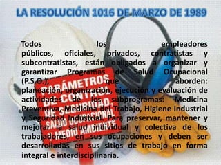 La resolución 1016/89 establece que todos los empleadores deben organizar y garantizar Programas de Salud Ocupacional que aborden la prevención, promoción y control de la salud de los trabajadores. Los programas deben incluir subprogramas de medicina preventiva, medicina del trabajo, higiene industrial y seguridad industrial, y deben actualizarse anualmente.
