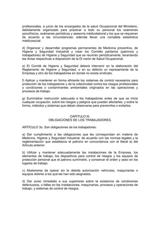 Este documento establece disposiciones sobre vivienda, higiene y seguridad en los establecimientos de trabajo. Define obligaciones para los patronos como proveer un medio ambiente de trabajo seguro e higiénico, establecer programas de salud ocupacional y capacitar a los trabajadores. También define obligaciones para los trabajadores como utilizar equipos de protección, reportar condiciones peligrosas y cumplir protocolos de salud y seguridad. Además, establece estándares mínimos para la construcción e infraestructura de los lugares