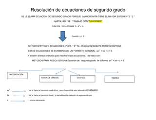 Este documento describe cómo resolver ecuaciones de segundo grado. Explica que una ecuación de segundo grado contiene una incógnita elevada al cuadrado y puede escribirse en un formato general de ax2 + bx + c = 0. Luego, detalla tres métodos para resolver estas ecuaciones: factorización, fórmula general y despeje, y proporciona ejemplos para ilustrar cada término de la ecuación.