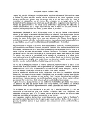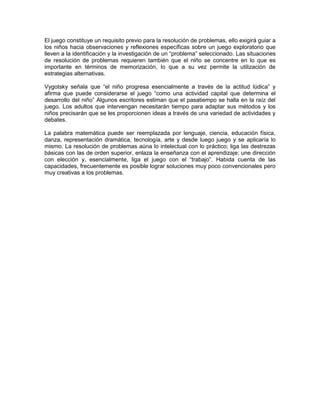 Este documento discute la importancia de la resolución de problemas en la educación de los niños. Señala que el juego de los niños les permite plantear y resolver problemas de manera natural. También destaca que los adultos deben guiar a los niños a identificar problemas específicos durante el juego exploratorio y proporcionar una estructura que les permita explorar nuevas situaciones y eventos. Además, enfatiza la necesidad de considerar la clase como un espacio lleno de problemas que los niños pueden resolver y de fomentar en ellos