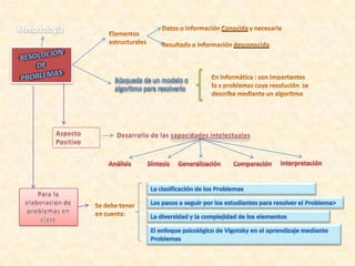 Este documento describe los pasos para resolver problemas, incluyendo analizar el problema, determinar los pasos principales de la solución, concretar la solución codificando los pasos del algoritmo, controlar los resultados e introducir acciones correctivas. También discute la construcción del conocimiento computacional y el papel de la pedagogía en crear procesos educativos que desarrollen la mente del alumno.