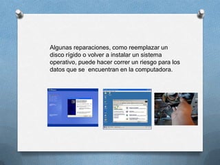 Este documento proporciona instrucciones para técnicos sobre cómo realizar reparaciones de computadoras de manera segura y efectiva. Recomienda que los técnicos creen siempre una copia de seguridad de los datos del cliente antes de comenzar cualquier trabajo, y obtener el consentimiento por escrito del cliente si no es posible crear una copia de seguridad. Además, da pautas sobre cómo diagnosticar y resolver problemas de manera sistemática, documentando cada paso del proceso para garantizar la seguridad de los datos del cliente.