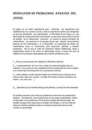 El documento describe cómo el juego puede usarse para enseñar matemáticas a los niños de manera efectiva. Explica que el juego les permite a los niños desarrollar habilidades como contar objetos, establecer correspondencias uno a uno, y reconocer el orden numérico. También menciona que el juego les da a los niños la oportunidad de resolver problemas de una manera activa y exploratoria. Concluye que los docentes deben usar el juego como una estrategia clave para la enseñanza de las matemáticas y el des
