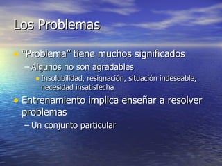 El documento describe los atributos de los problemas y el proceso de resolución de problemas. Explica que los problemas varían en su grado de estructuración, complejidad, dinamicidad y abstracción. También describe el proceso cognitivo de resolución de problemas, que implica construir un modelo mental del problema y manipularlo activamente para encontrar una solución. Finalmente, clasifica diferentes tipos de problemas como de lógica, algoritmos, toma de decisiones, diagnóstico, diseño y dilemas.