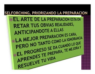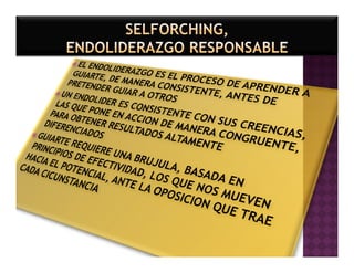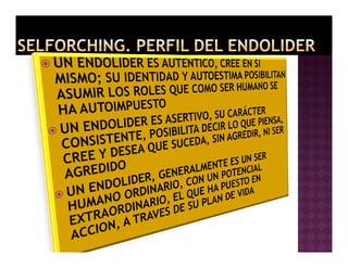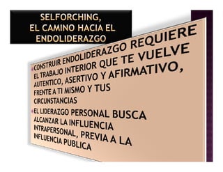 El documento presenta una propuesta de endoliderazgo y empoderamiento personal, enfatizando la importancia de la autoformación y el cambio a través de acciones concretas. Se describe un proceso de cuatro etapas para adquirir competencias en este ámbito, que incluye el estudio de materiales y desarrollo de programas de autoayuda. La filosofía central aboga por superar limitaciones y aprovechar el potencial personal para lograr nuevas metas y transformaciones.