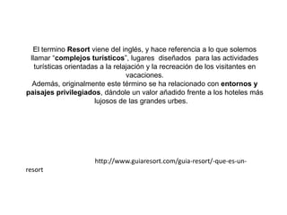 El documento describe un proyecto de resort ecológico llamado OASIS en la Guajira, Colombia. El resort utilizará energía renovable como paneles solares, turbinas eólicas y bombas de calor. Constará de 15 cabañas, piscinas, restaurante y otras instalaciones. El presupuesto es de 11 millones de dólares y se construirá en 3 etapas en unos 3 meses. El resort ofrecerá opciones de tiempo compartido y alquiler temporada alta y baja.