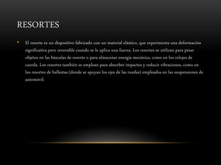 Los resortes son dispositivos elásticos que se deforman de manera reversible cuando se les aplica una fuerza. Existen tres tipos principales de resortes: resortes de tracción, compresión y torsión. Los resortes se utilizan para absorber impactos, almacenar energía, medir fuerzas y mantener posiciones. Pueden actuar en serie, donde cada resorte soporta la misma fuerza pero su deformación depende de su rigidez, o en paralelo, donde todos se deforman la misma cantidad independientemente de su rigidez.