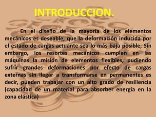 El documento trata sobre los diferentes tipos de resortes, incluyendo resortes helicoidales, resortes de tracción y compresión, y resortes de torsión. Explica cómo se clasifican y aplican los resortes, los materiales comúnmente usados en su fabricación, y los cálculos involucrados en el análisis de carga, esfuerzos y deformaciones de los diferentes tipos de resortes. También describe los usos más comunes de los resortes en máquinas y mecanismos.
