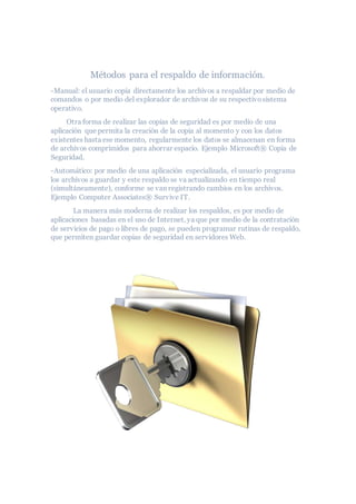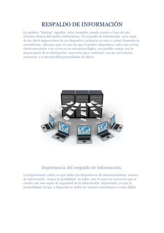 El documento describe la importancia del respaldo de información y los métodos para realizarlo. El respaldo de información implica copiar datos importantes de un dispositivo primario a uno o más dispositivos secundarios para prevenir la pérdida de datos en caso de falla del dispositivo primario. Es importante realizar respaldos porque todos los dispositivos están sujetos a fallas, y tener copias de seguridad reduce el riesgo de perder datos si dos dispositivos fallan a la vez. Los métodos de respaldo incluyen respaldos manuales, automáticos