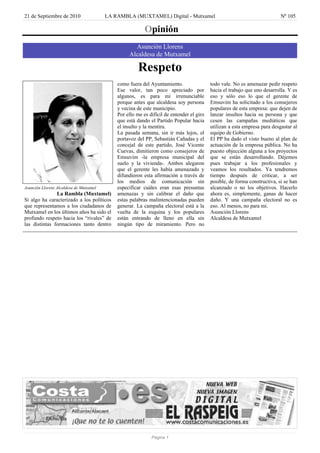 El documento es una opinión escrita por la alcaldesa de Mutxamel, Asunción Llorens. Expresa su descontento con el Partido Popular por lanzar insultos y mentiras hacia su equipo de gobierno. Recientemente, dos concejales del PP dimitieron de la empresa municipal Emsuvim alegando haber sido amenazados por el gerente, lo cual difundieron a través de los medios sin especificar detalles. La alcaldesa pide respeto hacia los profesionales y dejarlos trabajar, en lugar de hacer campañas para desg
