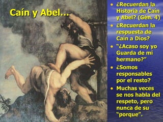 El documento habla sobre el respeto hacia los demás y hacia Dios. Explica que debemos respetar a otros porque somos responsables los unos de los otros, y dependemos de los demás para existir. También dice que debemos respetar a Dios por las mismas razones que respetamos a los demás, ya que Dios nos creó a todos. Finalmente, concluye que para amar a Dios debemos cuidar de los necesitados, porque en sus rostros vemos también el rostro de Dios.