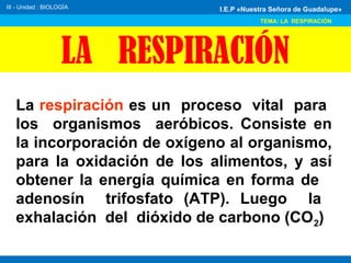 La respiración es un proceso vital que consiste en la incorporación de oxígeno al organismo para producir energía a través de la oxidación de los alimentos, y la exhalación de dióxido de carbono. Se lleva a cabo en dos fases, la respiración interna en las mitocondrias y la respiración externa en los pulmones u otros órganos como branquias o la piel, dependiendo del tipo de organismo.