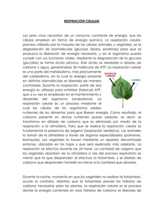 La respiración celular es el proceso mediante el cual las células degradan biomoléculas como la glucosa para liberar energía en forma de ATP, utilizando oxígeno. Esto permite que el organismo cumpla sus funciones vitales. En las mitocondrias, la glucosa se degrada a dióxido de carbono, agua y 36 moléculas de ATP. La respiración puede ser aerobia, usando oxígeno, o anaerobia, usando otros aceptores de electrones.