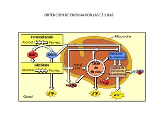 Este documento describe los procesos de respiración celular, incluyendo la glicólisis y el ciclo de Krebs. La respiración celular consiste en dos procesos, la glicólisis que no requiere oxígeno y el ciclo de Krebs que sí lo requiere. La glicólisis convierte la glucosa en ácido pirúvico en el citoplasma, mientras que el ciclo de Krebs ocurre en la mitocondria y produce energía en forma de ATP con la ayuda del oxígeno. El documento también