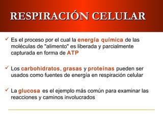La respiración celular implica tres procesos metabólicos principales: 1) la glucólisis, que ocurre en el citoplasma y rompe la glucosa en piruvato, generando un poco de ATP; 2) el ciclo de Krebs en la mitocondria, donde el piruvato se oxida completamente, generando más ATP y electrones de alta energía; 3) la fosforilación oxidativa en la membrana mitocondrial interna, donde los electrones se mueven a lo largo de una cadena transportadora de electrones para bombear protones, estable