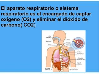 El documento describe el aparato respiratorio y su función de captar oxígeno y eliminar dióxido de carbono. Explica que para mantener un buen funcionamiento del sistema respiratorio es importante respirar profundamente y realizar ejercicios respiratorios. También recomienda medidas como protegerse del frío, alimentarse saludablemente y evitar el humo del tabaco para prevenir enfermedades respiratorias.