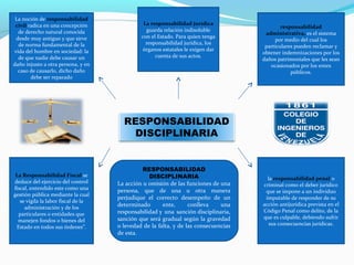Este documento define varios tipos de responsabilidad como la responsabilidad civil, jurídica, administrativa, fiscal y penal. La responsabilidad civil se basa en el daño injusto causado a otra persona. La responsabilidad jurídica está relacionada con el estado. La responsabilidad administrativa permite que las personas obtengan indemnizaciones por daños causados por entidades públicas. La responsabilidad fiscal controla el manejo de fondos públicos. La responsabilidad penal se refiere a delitos previstos en el código penal.