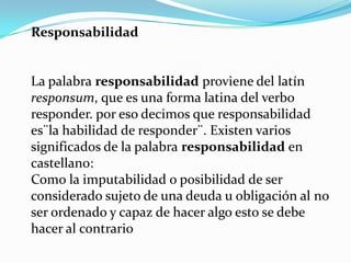 La responsabilidad se refiere a la capacidad de responder por los propios actos y sus consecuencias. Implica cargos, obligaciones y la virtud de ser libre y causante de los propios actos. Para Kant, la responsabilidad es la virtud de concebir las máximas de la conducta de forma libre y consciente, mientras que para Jonas es una virtud social que ordena actuar de forma compatible con la vida humana en la Tierra. La responsabilidad reside en la conciencia para reflexionar sobre las consecuencias de los actos en el plano moral