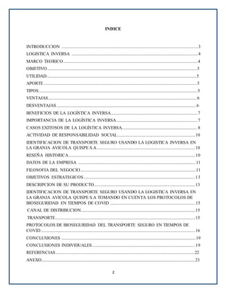 Este documento describe la logística inversa y su aplicación en la Granja Avícola Quispe S.A. En primer lugar, define la logística inversa y sus objetivos. Luego, identifica los protocolos de bioseguridad para el transporte seguro de productos avícolas en tiempos de COVID-19 en esta empresa. Finalmente, concluye que la logística inversa y sus protocolos permiten distribuir de manera segura los productos avícolas durante la pandemia.
