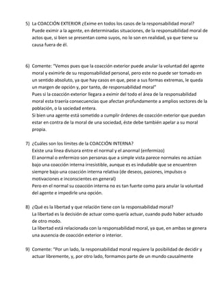 Este documento explora el tema de la responsabilidad moral, el determinismo y la libertad. Discuten las condiciones para que un sujeto asuma responsabilidad moral, como requiriendo conocimiento de las circunstancias y consecuencias de sus acciones, y que sus actos sean libres sin coacción exterior. También analiza cómo la coacción exterior o interior pueden eximir parcial o totalmente de responsabilidad, dependiendo del grado en que anulan la voluntad. Finalmente, debate si es posible la libertad en un mundo determinado por causas y efectos
