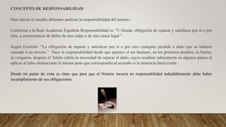 El documento habla sobre la responsabilidad del notario cuando se declara la nulidad de un acto jurídico autorizado. Explica que el notario es responsable civil, penal, administrativa y fiscalmente por sus actos y omisiones en el ejercicio de su función. Asimismo, el notario está obligado a reparar cualquier daño causado, cubriendo los costos con una fianza de garantía por un millón de pesos.