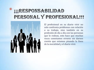 El documento discute la responsabilidad personal y profesional. Sostiene que los profesionales enfrentan problemas relacionados con su trabajo y en sus interacciones diarias, lo que a veces los lleva a cometer errores sin darse cuenta que están cruzando la línea de la moralidad. También argumenta que una verdadera responsabilidad profesional debe surgir de la responsabilidad personal, y que con una actitud positiva y entusiasmo por el éxito, los profesionales pueden lograr la excelencia en su trabajo diario.