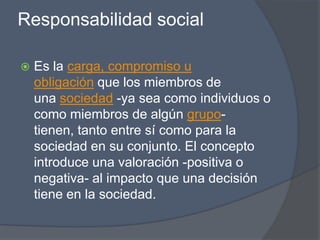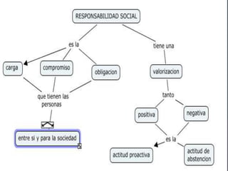 La responsabilidad social se refiere a la obligación que tienen los individuos y grupos dentro de una sociedad tanto entre sí como para con la sociedad en general. Incluye una valoración ética y legal del impacto de las decisiones en la sociedad. Las competencias ciudadanas son conocimientos y habilidades que permiten a las personas participar en una sociedad democrática e inclusiva. Las competencias laborales son conocimientos, habilidades y actitudes necesarias para que los jóvenes se desempeñen de manera productiva. Los fines de la educación incluyen proporcionar