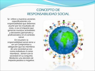 Este documento trata sobre el concepto de responsabilidad social. Explica que la responsabilidad social se refiere a las consecuencias de nuestras acciones y decisiones, tanto personales como profesionales, en la sociedad. También resume brevemente la historia del concepto desde los filósofos griegos y romanos, e identifica algunas funciones y ejemplos actuales de responsabilidad social en organizaciones e individuos. Finalmente, concluye que la responsabilidad social es una obligación de las organizaciones para perseguir metas a largo plazo que beneficien a