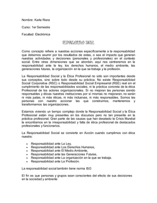El documento habla sobre la responsabilidad social y ética profesional. Explica que la responsabilidad social se refiere al impacto que tienen nuestras acciones y decisiones en la sociedad y el medio ambiente. También menciona que la responsabilidad social solo es real cuando cumplimos con nuestra ética profesional en relación a la ley, los derechos humanos, el medio ambiente y las generaciones futuras. Finalmente, señala que la responsabilidad social promueve la formación de ciudadanos comprometidos con las injusticias.