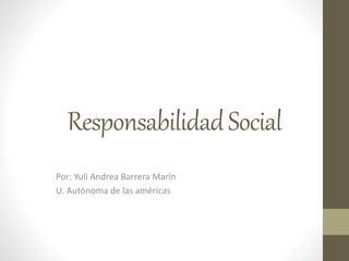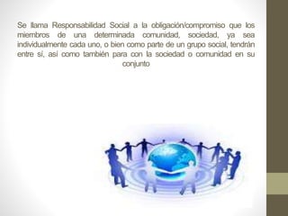 La responsabilidad social se refiere a la obligación de los individuos y grupos hacia la sociedad. Surge de la necesidad de las personas de relacionarse y cumplir reglas de comportamiento. En la antigua Grecia y Roma, la responsabilidad social implicaba la participación ciudadana y el respeto a las leyes. En la Edad Media, la responsabilidad social significaba aceptar la religión y respetar la privacidad y propiedad ajenas. Hoy en día, la responsabilidad social incluye la responsabilidad empresarial, gubernamental, ambiental e individual.